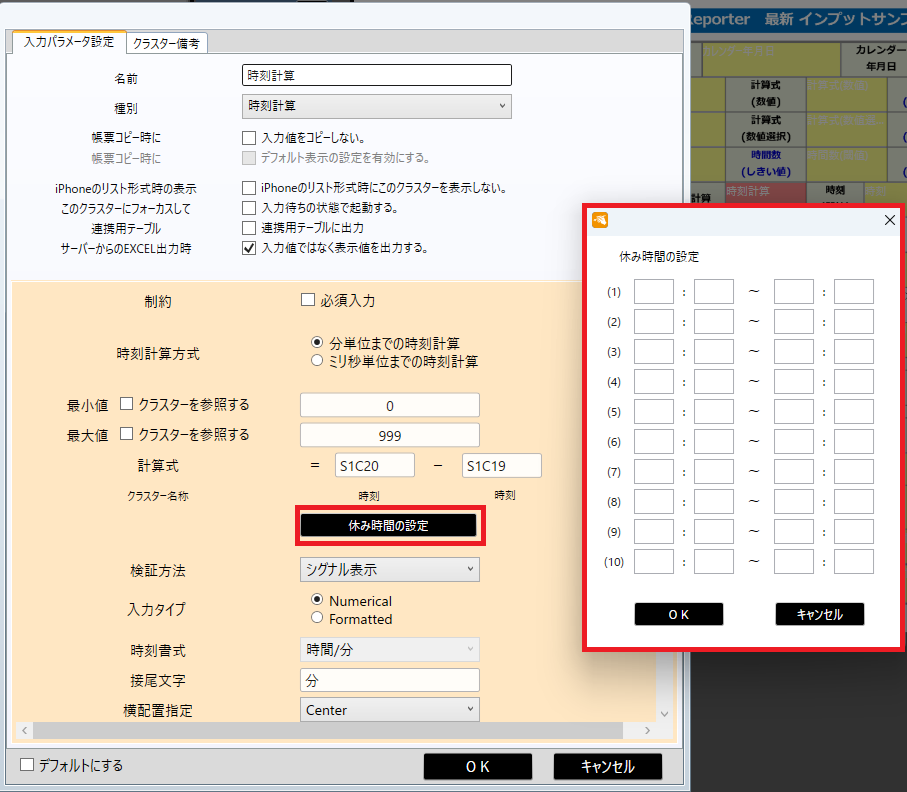 なお、i-Reporterは日付や時刻に関する情報はシリアル値として扱っているため、数値クラスター等に休憩時間や中断時間を入力する場合は、シリアル値に変換してから時刻クラスターとの計算を行う必要があります。