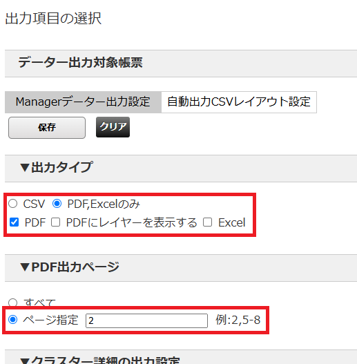 ConMas Managerの「データー出力」の「出力項目の選択」画面にて、「▼出力タイプ」を「PDF」にした後に「▼PDF出力ページ」の「ページ指定」で出力したいページを指定します。