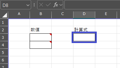 - 下記のD3セル(青枠)に計算式クラスターを作成することとする。