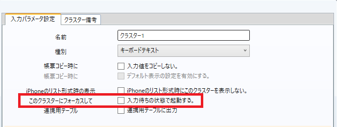 「このクラスターにフォーカスして入力待ちの状態で起動する。」機能は、ConMas Designerでクラスターの入力パラメータ設定の上部にてチェックを入れることで有効になる機能です。