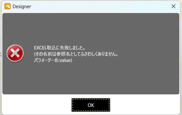 <ConMas Designer>エラーメッセージ:EXCEL取込に失敗しました。(その名前は参照名としてふさわしくありません。パラメーター名:value)