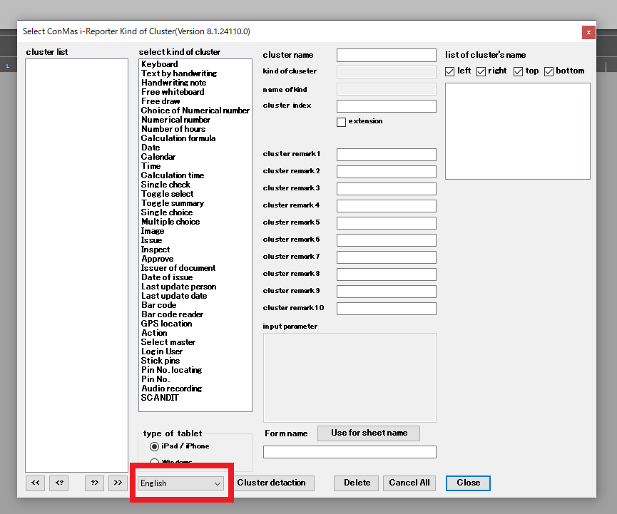 クラスター種別設定画面の左下に言語設定のリストボックスがありますので、ここから言語設定を切り替えてください。