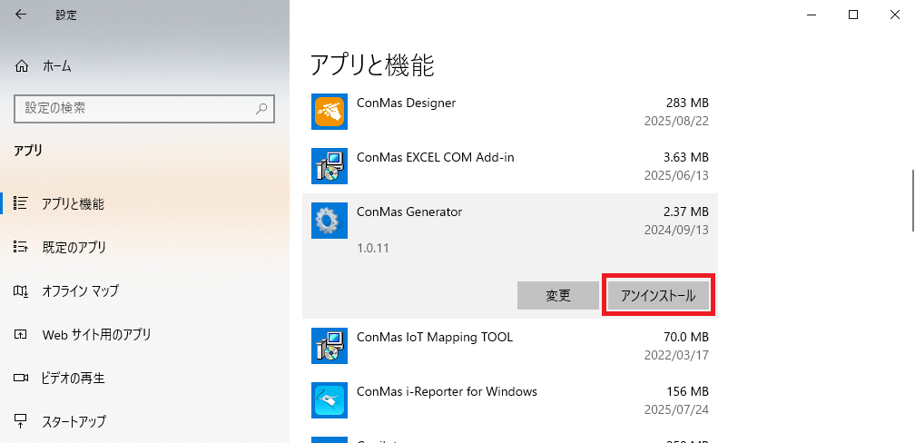 ConMas Generatorのアンインストール方法を教えてください ConMas Generatorのアンインストールは、一般的なソフトウェアと同様にアンインストールしてください。 【アンインストール手順例】 Windowsの「スタート」-「設定」をクリックして開く 「アプリ」をクリックして「アプリと機能」を開く アプリのリストから「ConMas Generator」をクリックし「アンインストール」をクリックする ダイアログに沿って操作することでアンインストールできます