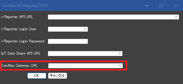 ConMas IoT Mapping Toolの接続設定にある「ConMas Gateway URL」には、ConMas Gateway URLをインストールしたPCのIPアドレスを入力してください。