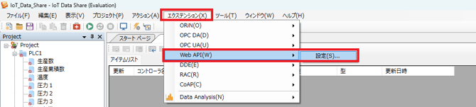 IoT Data Shareの「エクステンション」→「Web API」→「設定」タブで、アイテムのチェックボックスがONになっているか確認してください。
