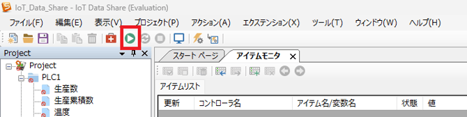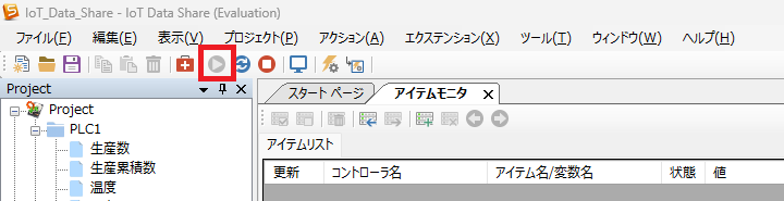 IoT Data Shareのプロジェクトの実行アイコンがクリック可能な場合、プロジェクトは停止しています。