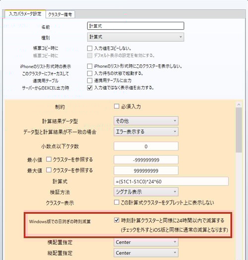 これは、Windows版i-Reporterアプリでは計算式クラスターで日を跨ぐ時刻計算を行っても、日を跨ぐことを考慮した計算結果が表示される(※後述の注意事項参照)のに対して、iOS版i-Reporterアプリでは日を跨ぐことを考慮した計算結果が表示されない為です。