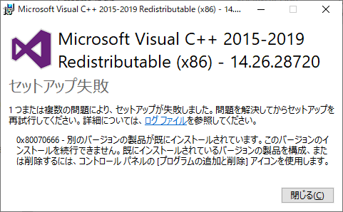 VC_redist.x86.exe のインストール時に「セットアップ失敗」と表示されてインストールに失敗する